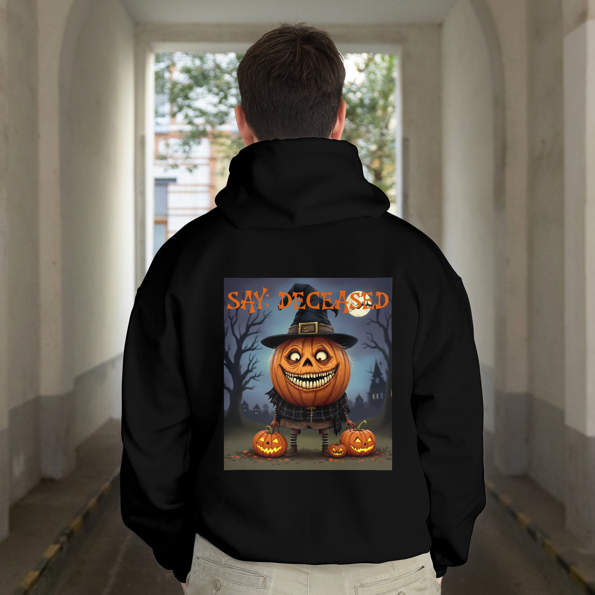 Rückendruck mit detailreichem Halloween-Artwork: ein grinsender Kürbiskopf im Spukwald, Schriftzug „Say: Deceased“.