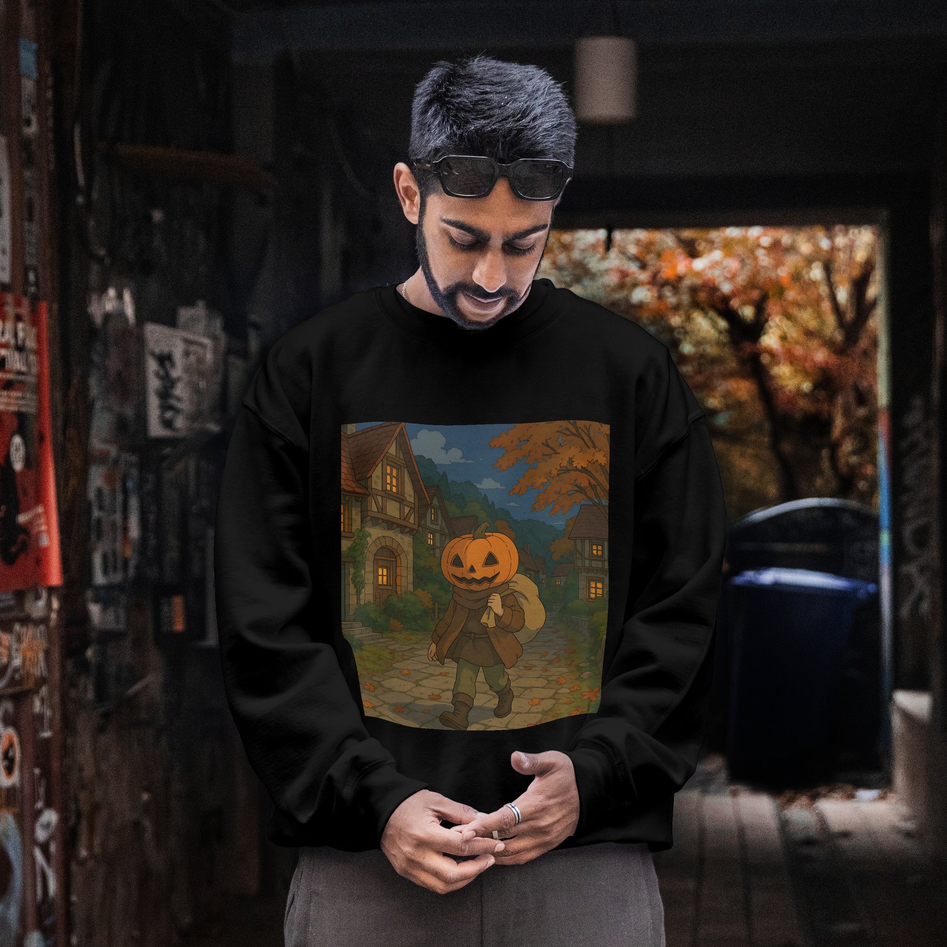 Dieser Sweater bringt herbstliche Vibes direkt in deine Garderobe! Das große Frontmotiv zeigt eine charmante Szene: Eine Figur mit Kürbiskopf wandert durch ein herbstlich geschmücktes Dorf – perfekt für alle, die Halloween lieben, aber es auch stilvoll und gemütlich mögen.